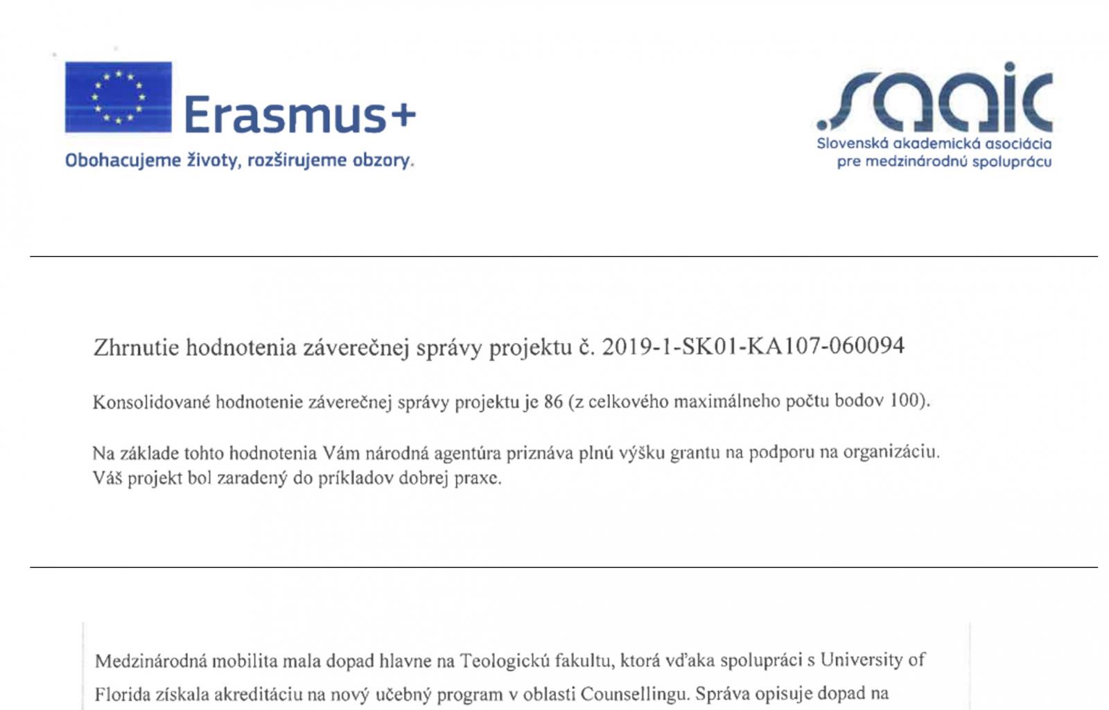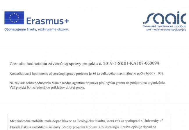 Projekt Trnavskej univerzity KA107 – 2019 bol najmä vďaka Teologickej fakulte.zaradený Slovenskou akademickou asociáciou pre medzinárodnú spoluprácu do príkladov dobrej praxe.