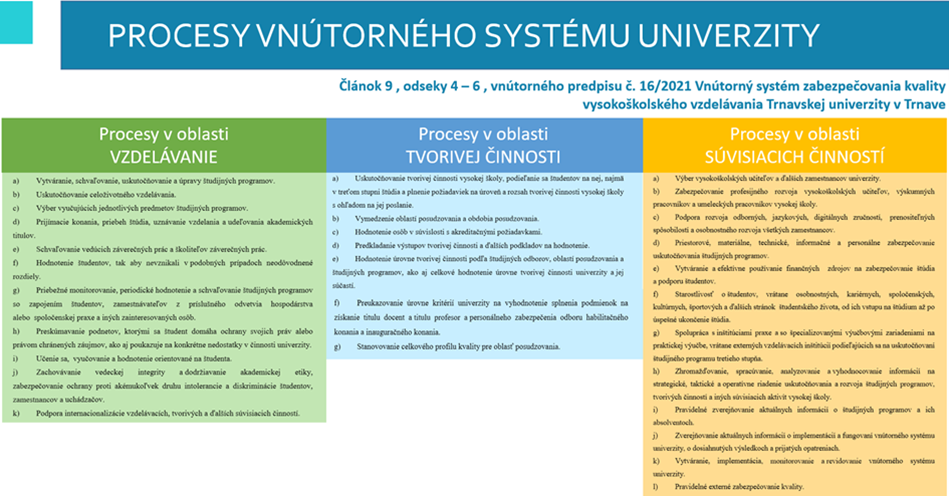 Univerzita a jej fakulty zabezpečujú a hodnotia úroveň kvality poskytovaného vysokoškolského vzdelávania prostredníctvom procesov, ktoré sú stanovené pre oblasť vzdelávania, oblasť tvorivej činnosti a oblasť súvisiacich činností.